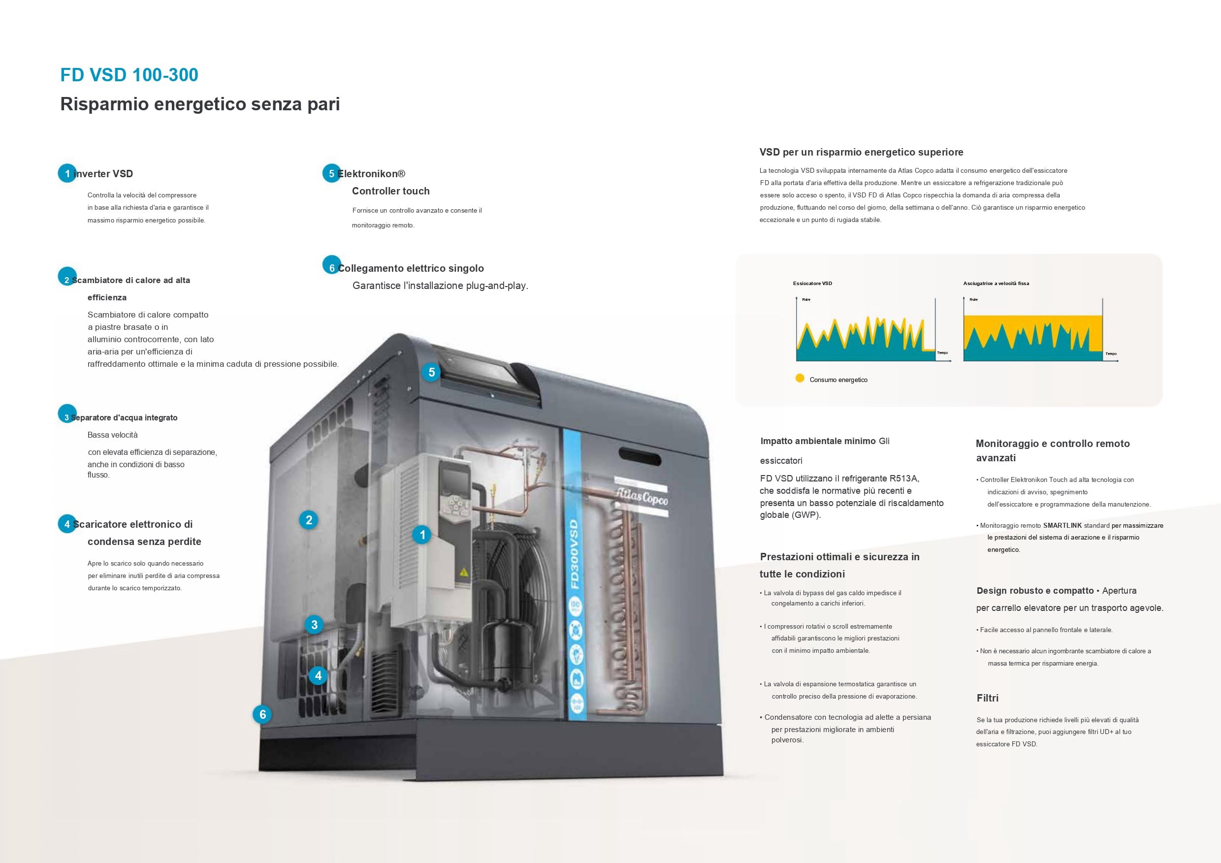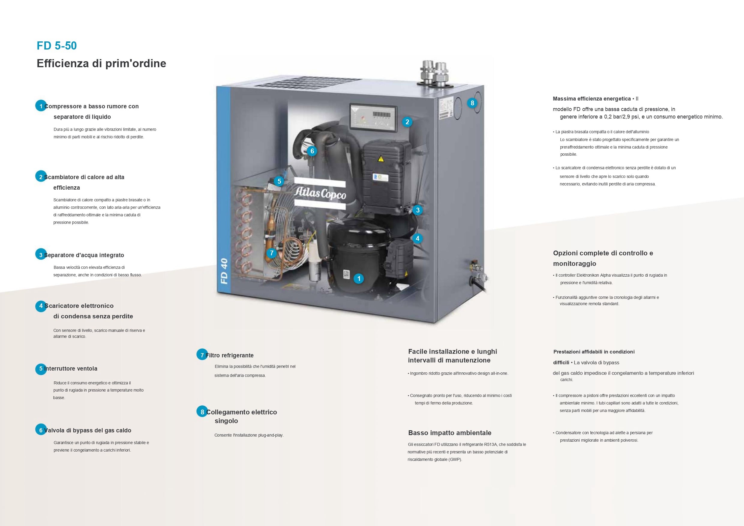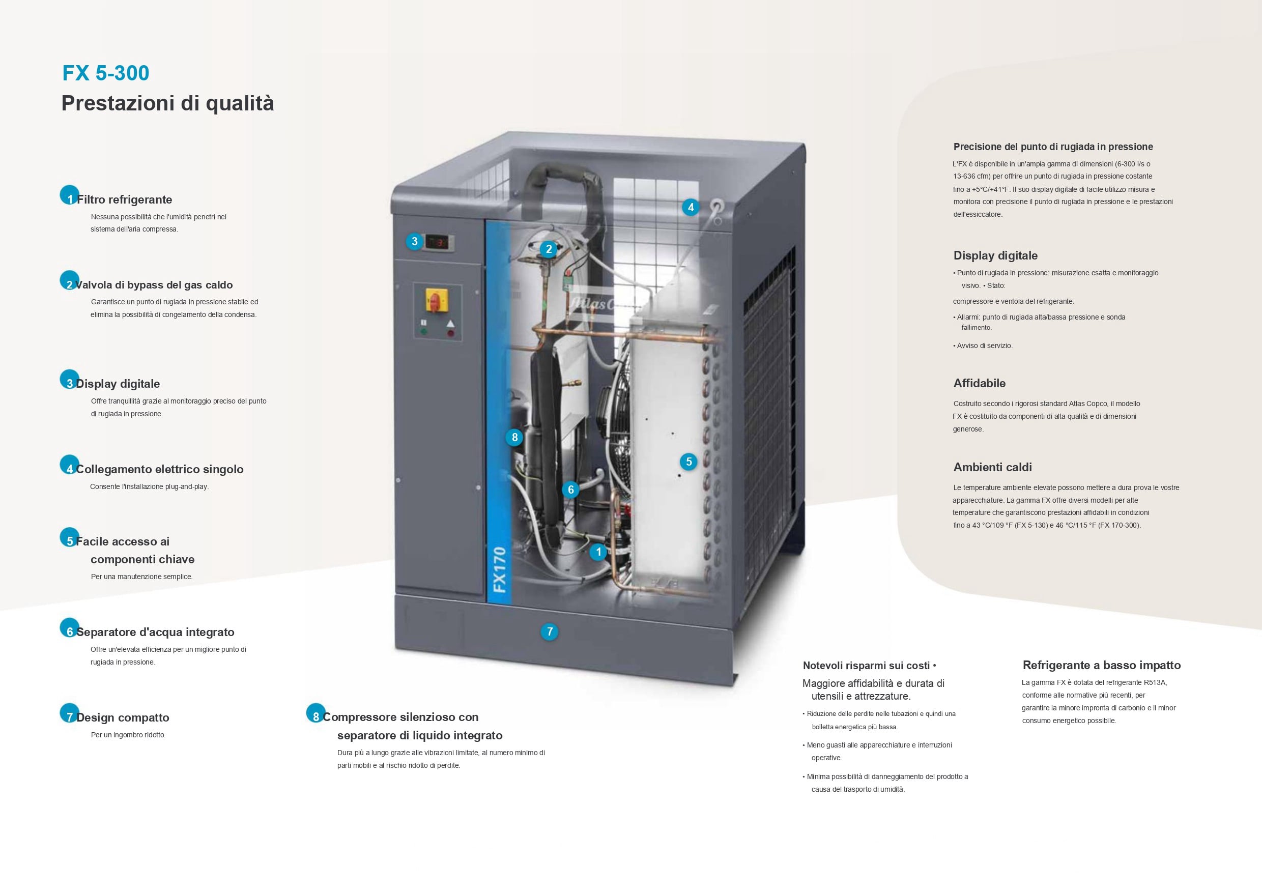 Gli essiccatori a refrigerazione Atlas Copco forniscono l'aria pulita e secca di cui avete bisogno per prolungare la durata delle vostre apparecchiature e garantire la qualità dei vostri prodotti. I nostri essiccatori FD VSD, FD e FX sono progettati internamente e testati secondo i metodi più rigorosi. Soddisfano o superano gli standard internazionali di purezza dell'aria compressa e sono testati secondo la norma ISO 7183:2007.